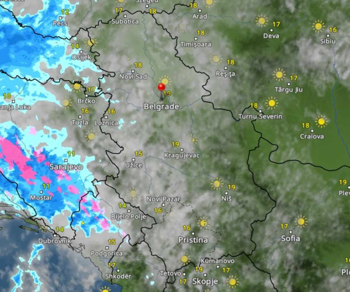 Do kasnih večernjih sati, padavinski front će se zadržati iznad centralnih i zapadnih predela, dok će istok i jug Srbije, uključujući gradove poput Niša i Bora, prema trenutnim radarskim prikazima ostati suvi ili samo okrznuti ivicom oblačnosti.