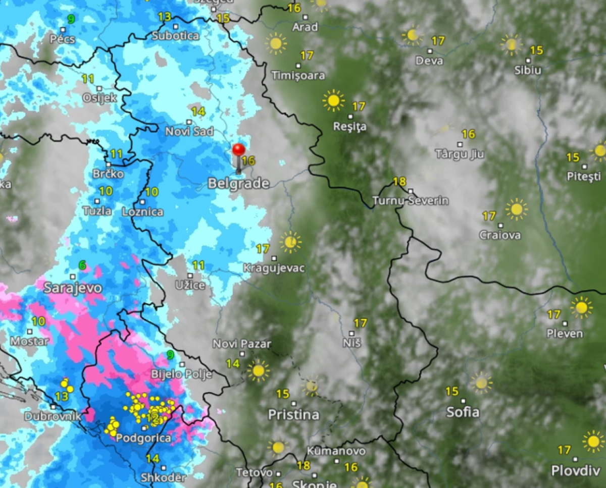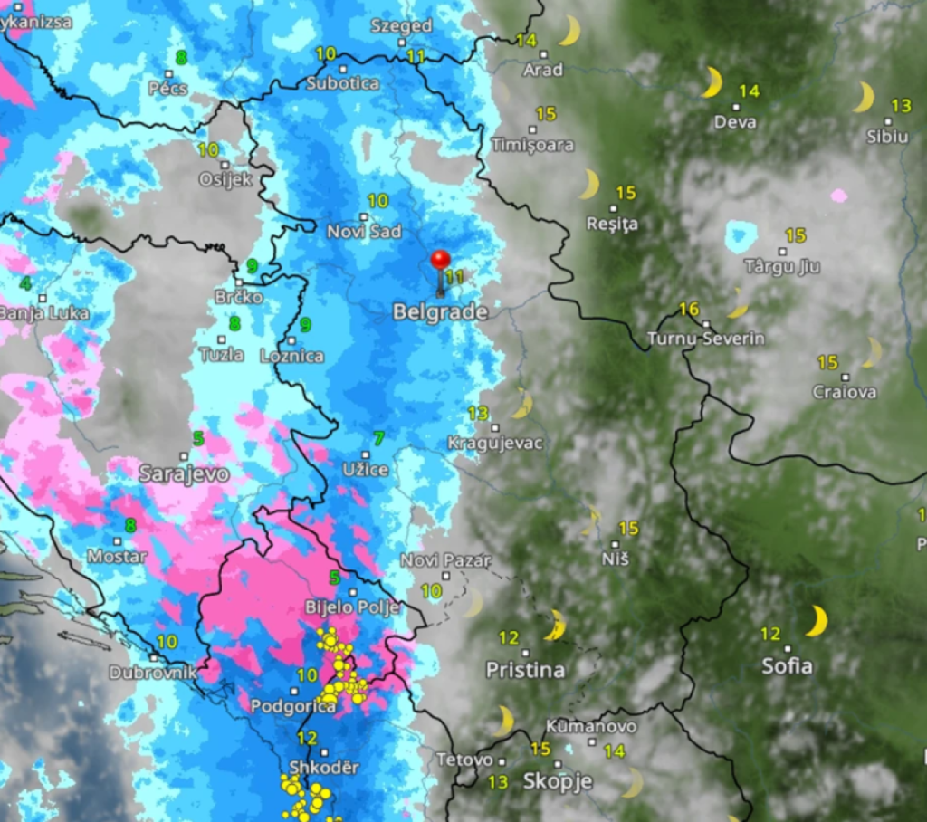 Radarski snimci pokazuju drastičan pad temperature, tako da će do 19 sati u prestonici biti tek 11 stepeni Celzijusove skale.
