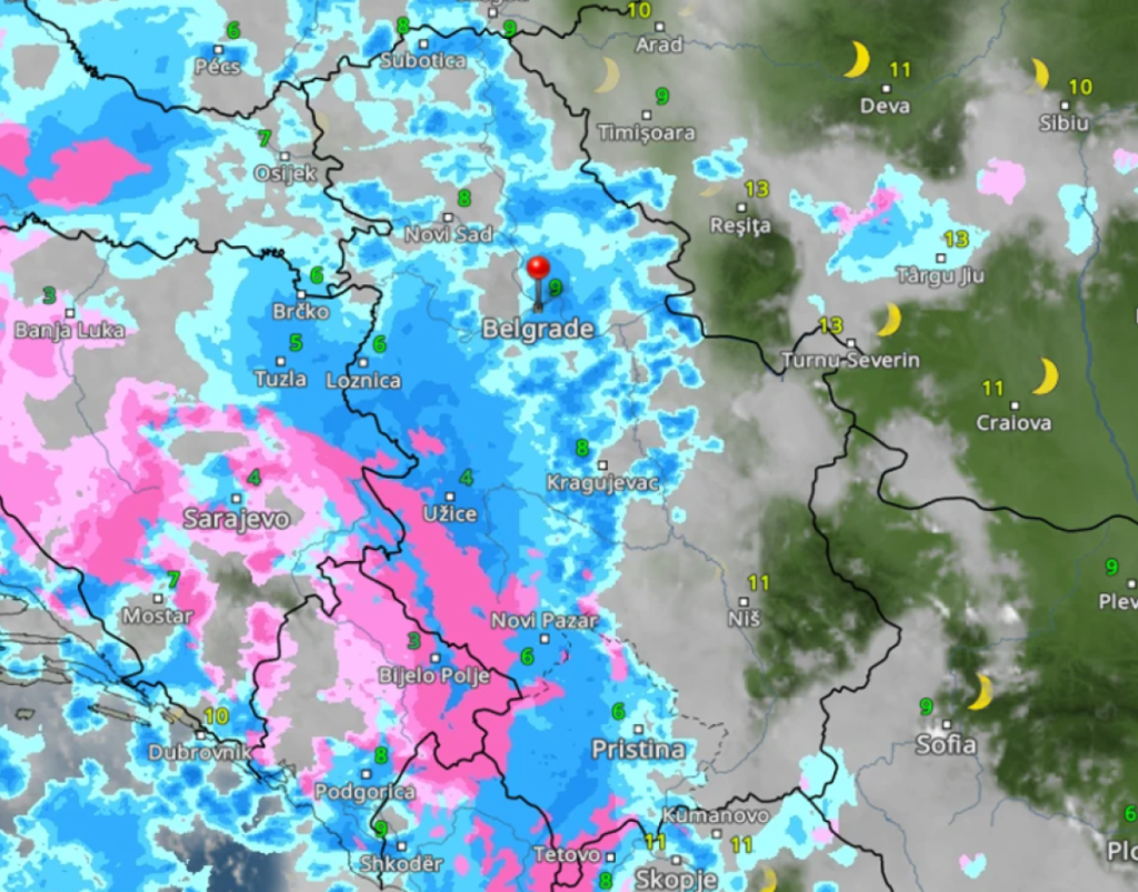 Tokom noći, oblačni sistem će se proširiti i nad jugozapadnim delovima Srbije, donoseći intenzivne padavine u predele oko Prijepolja, Bijelog Polja i Novog Pazara. U večernjim satima, tačnije oko 21 čas, kiša će uveliko natapati veći deo Šumadije, zapadne Srbije i Vojvodine, sneg će zabeleti planine jugozapadne Srbije, dok će temperatura u Beogradu nastaviti da pada na 10 stepeni.