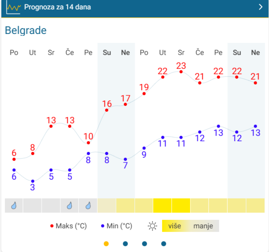 Danas će biti oblačno i hladno vreme, mestimično sa kišom. Na planinama će padati slab sneg. Temperature će se kretati od 4 do 13 stepeni Celzijusove skale.