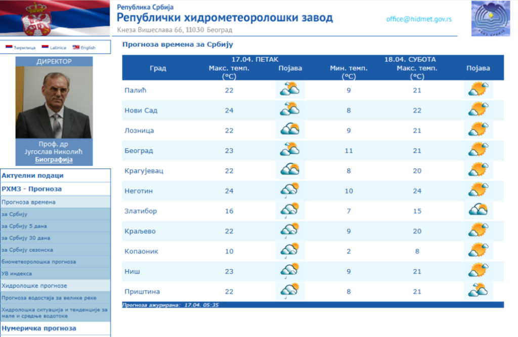 - Za vikend pretežno sunčano uz dnevni razvoj oblačnosti u brdsko-planinskim predelima. U ponedeljak naoblačenje sa kišom i pljuskovima sa grmljavinom koje će pre podne zahvatiti severne i zapadne, a posle podne će se proširiti i na ostale predele. Od utorka manji pad temperature, promenljivo i nestabilnije vreme, mestimično sa kišom i kratkotrajnim pljuskovima sa grmljavinom - navode iz RHMZ.