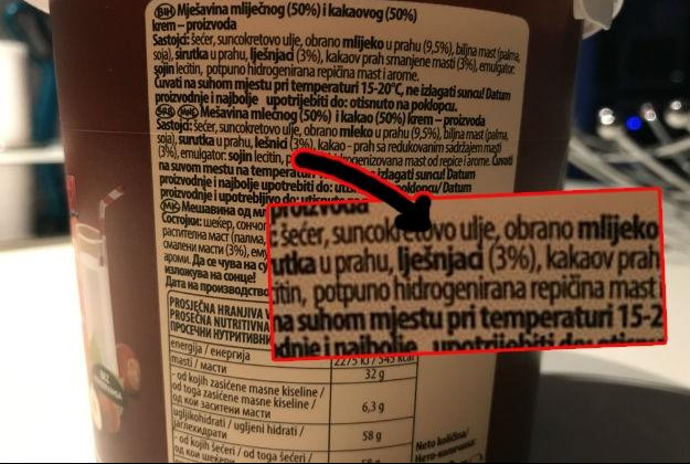 Konkretno, "linolada" u BiH i Srbiji ima svega tri odsto lešnika, dok se u Hrvatskoj, prema zvaničnoj deklaraciji, u ovom namazu nalazi čak 10 odsto lešnika (vidite okvir).