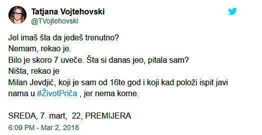 Tatjana Vojtehovski, autorka emisije "Život priča", istakla je da Milan ni u jednom trenutku nije sporio da je jedno vreme dobijao pomoć od nekih ljudi, ali da je više ne dobija iz raznih razloga. Ipak, nije objasnila zbog čega je baš on toliko drugačiji od stotine drugih mladih ljudi koji uprkos siromaštvu uspešno završavaju fakultete.- Ono što nismo rekli jeste da su neke pomoći bile uslovljavane na vrlo neprijatne načine. Ekipa emisije "Život priča" je imala uvid u pisane tragove tih uslovljavanja, koje po zakonu ne možemo da objavimo. Ono što smo videli nije bilo prijatno čak ni za čitanje. Čudan smo mi svet. Skloni da donosimo zaključke i da sudimo na osnovu pretpostavki i ličnih interpretacija - rekla je Vojtehovska, uz objašnjenje da je pre snimanja emisije proverila sve detalje o Milanovom životu: