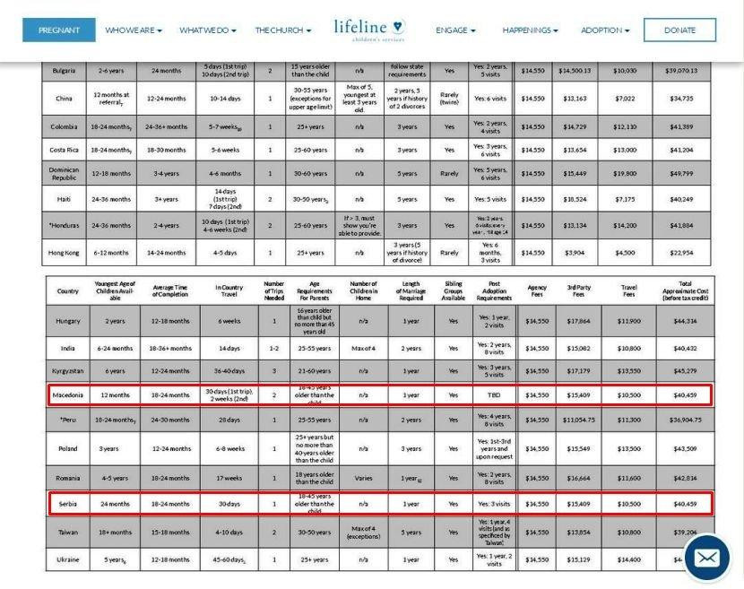 Navedeno je i to da će onaj ko namerava da usvoji dete iz Srbije morati da odvoji 40.459 dolara ili 33.000 evra. Isti je iznos i za decu iz Makedonije. Od te sume, za agenciju ide 12.000 evra, za treću stranu (nije naznačeno koju) skoro 13.000 evra, a za putne troškove 8.000.