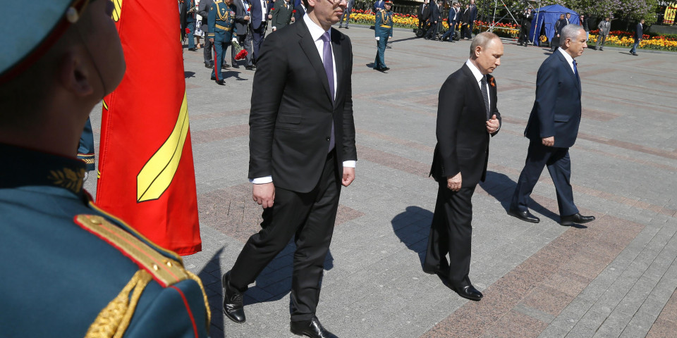10. 35 - Predsednik Srbije Aleksandar Vučić danas je zajedno sa predsednikom Ruske Federacije Vladimirom Putinom i premijerom Izraela Benjaminom Netanijahuom položio venac na spomenik Neznanom junaku u Moskvi.
