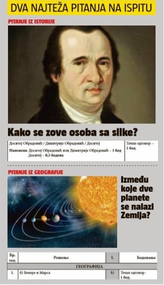 Najviše brige, kako kažu osmaci, izazvalo je pitanje iz istorije u kome je trebalo da na fotografiji prepoznaju Dositeja Obradovića!? Na papiru je bila fotografija velikog srpskog prosvetitelja i pisca dela "Život i priključenija", ali prema rečima đaka, većina nije bila sigurna ko je na slici.