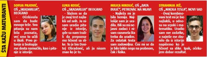- Ovaj test je bio najlakši do sada, a probni kombinovani test je bio mnogo teži. Svi smo očekivali da će hemija biti najteža, ali mene je ipak najviše namučilo pitanje o Dositeju Obradoviću. Dali su nam njegovu sliku i trebalo je da napišemo ko je na njoj. Kad smo izašli, svi uglas smo pričali o tom pitanju, jer većina nije sigurna koji je tačan odgovor. Trebalo mi je dosta vremena da razmislim, ali sam se setio ko je u pitanju - samouveren je Miloš.