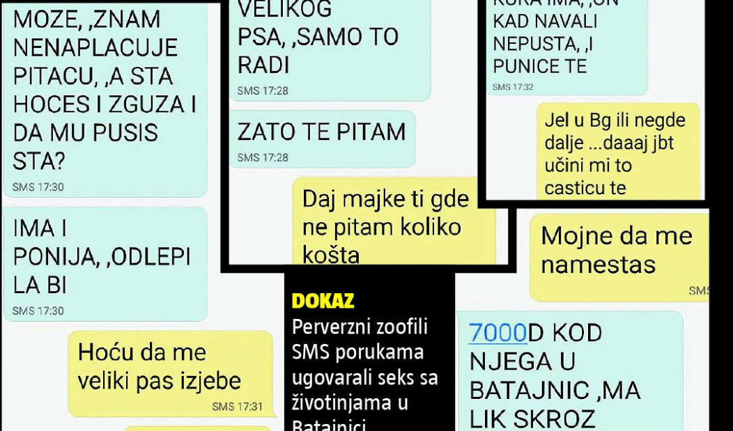 - Ne može se tačno reći da su bordeli u pitanju, više su to mesta, kuće ili stanovi u kojima se događaju ovakve devijantne stvari. Mi smo sa sigurnošću otkrili da u Batajnici postoji ovakvo mesto. Tamo osobe za seksualne aktivnosti sa životinjama plaćaju u proseku oko 7.000 dinara. Moguće je da su čak u međuvremenu promenili lokaciju, pošto to često čine da ih ne bi otkrili. Ovakva okupljanja su identična sektaškim - kaže Bihali i dodaje da je njihov pokret već reagovao i obratio se nadležnim institucijama.