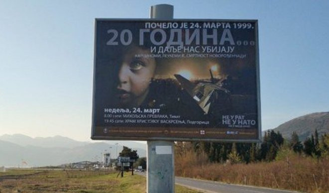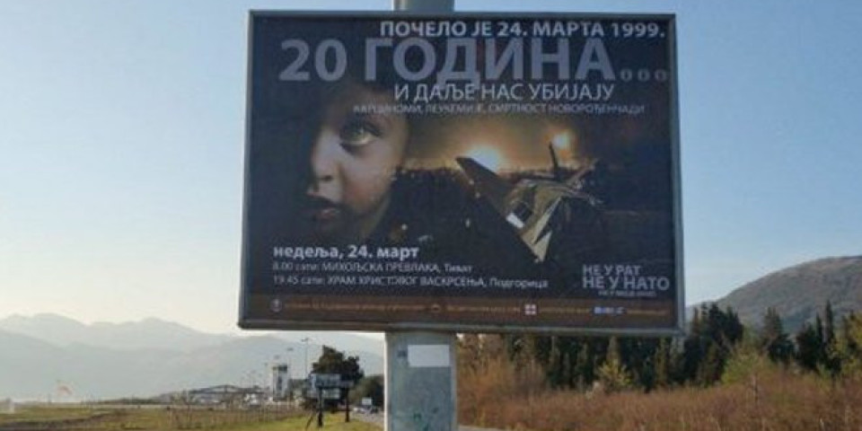 Na bilbordima se nalazi natpis "Počelo je 24. marta 1999. godine. 20 godina i dalje nas ubijaju karcinomi, leukemije, smrtnost novorođenčadi".