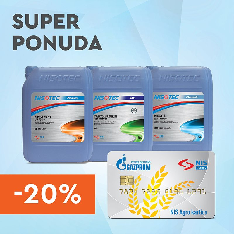 Do kraja septembra, uz NIS Agro karticu potrošače očekuje 20 odsto popusta prilikom kupovine odabranih NISOTEC ulja za poljoprivrednu mehanizaciju, u pakovanjima od 10 i 20 litara. Reč je o dodatnoj pogodnosti namenjenoj korisnicima NIS Agro kartice koja tokom cele godine poljoprivrednicima obezbeđuje mnogobrojne popuste na gorivo i dopunski asortiman u okviru najveće maloprodajne mreže naftnih derivata na domaćem tržištu, odnosno na više od 300 NIS Petrol i GAZPROM maloprodajnih objekata širom Srbije.