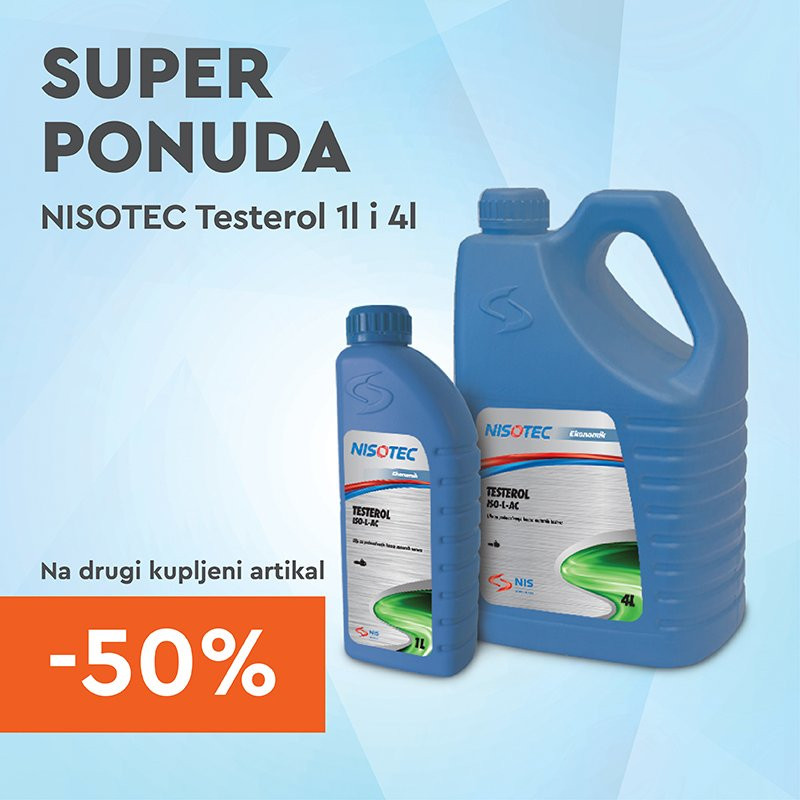 Takođe, uz kupovinu NISOTEC TESTEROL u pakovanju od 1 i 4 litra potrošači do kraja meseca mogu da računaju i na 50 odsto popusta na drugi kupljeni proizvod u istom pakovanju. Reč je o ulju mineralne osnove koji je namenjen za podmazivanje lanaca svih tipova ručnih motornih i električnih testera a koje obezbeđuje dobru prionjivost, izuzetnu zaštitu od habanja, rđe i korozije lanaca u svim vremenskim uslovima. Foto: NIS Promo