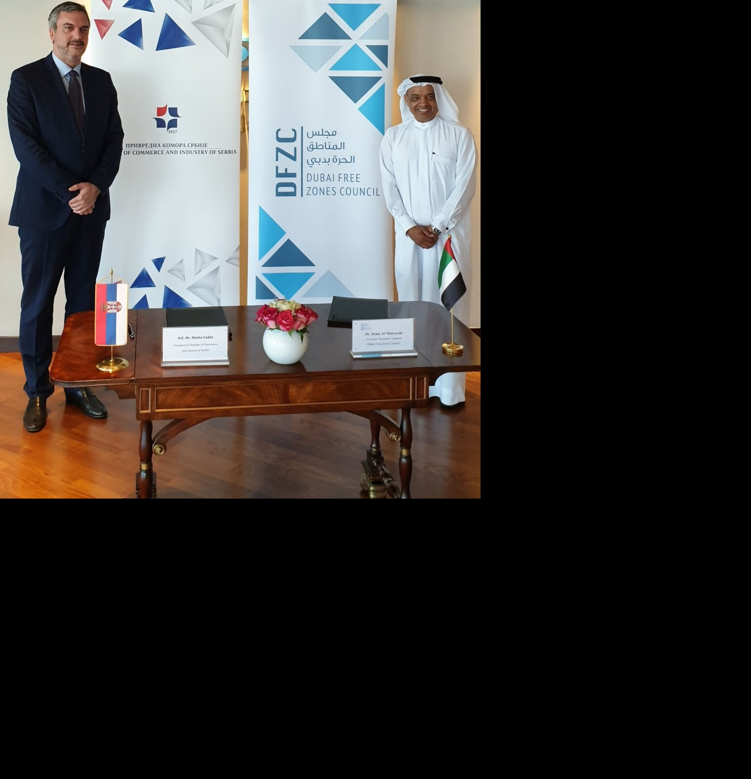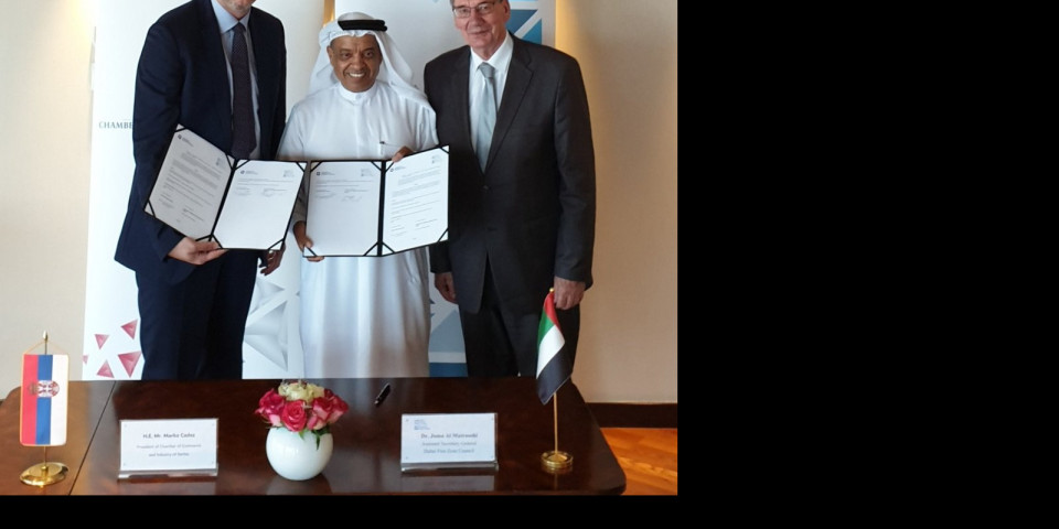 - Dokumentom koji je danas potpisan sa Džumom Al Matrušijem, prvim čovekom Strateškog komiteta Saveta slobodnih zona Dubaija, Privredna komora Srbije našim privrednicima obezbeđuje povlašćene uslove za poslovanje u 11 slobodnih zona Dubaija koje okuplja ovaj Savet. To podrazumeva ubrzane procedure za otvaranje kompanija, pribavljanje dozvola, carinske i inspekcijske dokumentacije, kao i mogućnost analize tržišta, finansiranja projekata i pronalaženje adekvatnih partnera za njihovu realizaciju. Ulaskom u slobodne zone Dubaija, o čemu već pregovaraju prve naše kompanije, srpskoj privredi otvara se mogućnost izlaska i na druga tržišta regiona, Afrike i Indije - izjavio je Marko Čadež, predsednik Privredne komore Srbije.