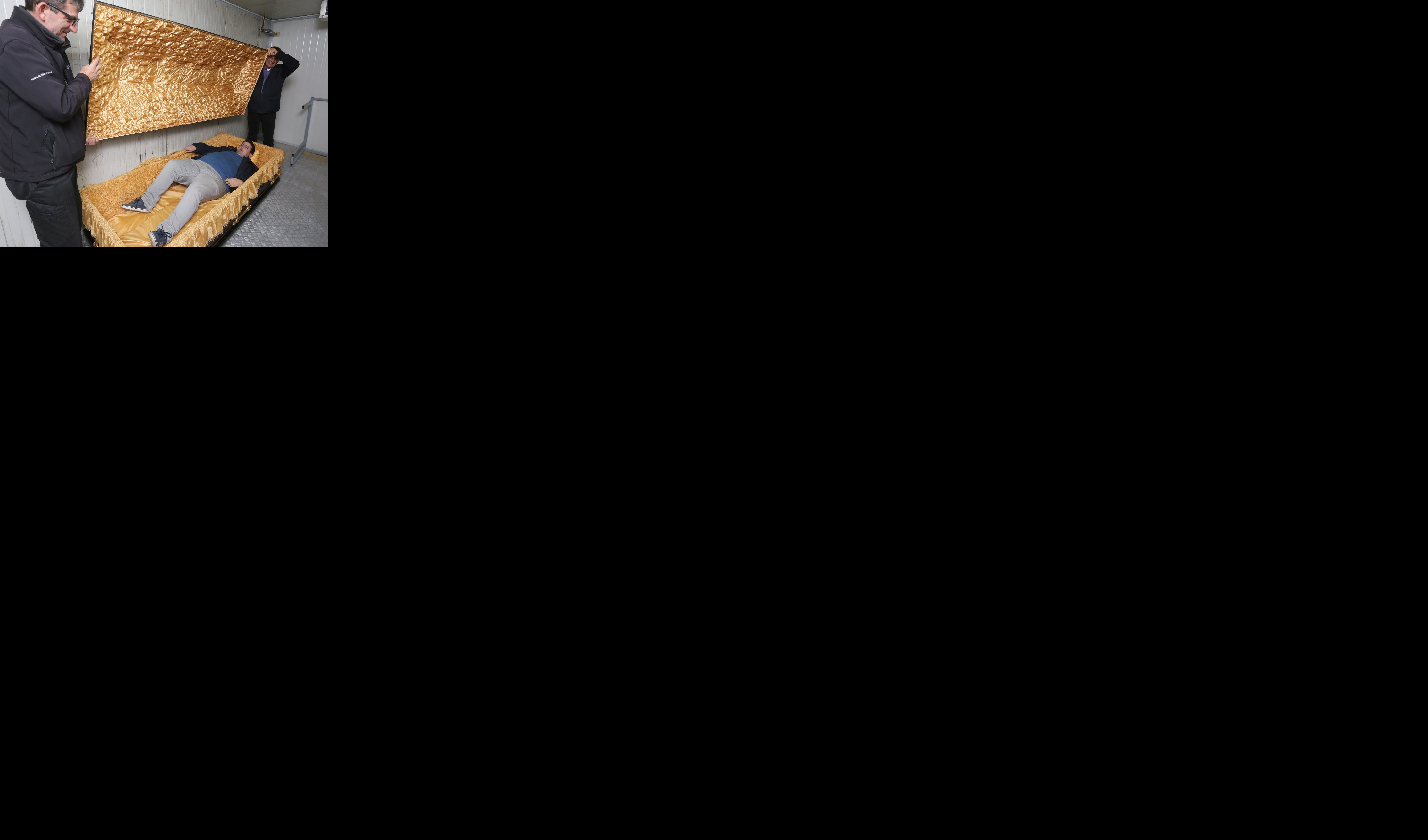 Nakon što je pronađen odgovarajući sanduk, novinar je legao u sanduk u hladnjači, okružen mrtvim ljudima, i isprobao ga.