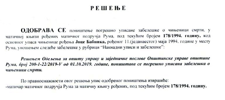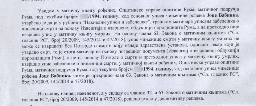 U izvodu iz matične knjige rođenih stajala je samo zabeleška o smrti Joce Babnike na osnovu obdukcionog nalaza, koja je sada poništena.