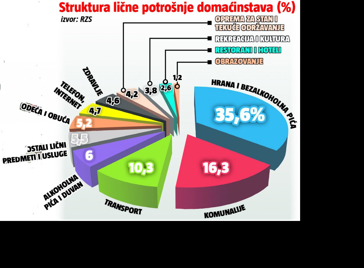 Najveći deo primanja očekivano trošimo na hranu i piće, i to trećinu, dok 16,3 odsto odlazi na plaćanje komunalnih usluga. Međutim, Srbi veliki iznos novca troše i na obrazovanje. U praksi to znači da ukoliko domaćinstvo raspolaže dvema prosečnim platama, odnosno sa 108.000 dinara, od toga mesečno na hranu odlazi 38.448 dinara, na alkohol i cigare 6.480 dinara, na telefon 5.076 dinara, dok domaćinstvo za obrazovanje izdvoji svega 1.296 dinara.