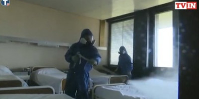 Na snimku se vidi kako u hodniku, pod punom zaštitnom opremom i prskaju sve što im se nađe na putu.