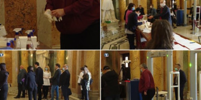 Poslanici su danas na ulazu u Skupštinu prolazili kroz sigurnosna vrata gde im je infracrvenim sistemom za merenje temperature izmerena telesna temperatura, a nakon toga je vršena dezinfekcija ruku.