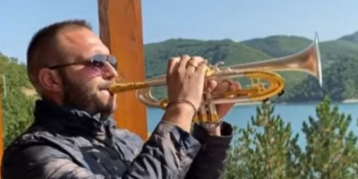 Zvuci srpske himne „Bože pravde“ odjekivali su juče na jezeru Gazivode iz trube najboljeg srpskog trubača Dejana Petrovića iz Užica