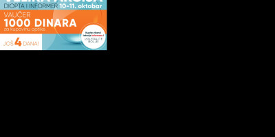 Tokom oktobra meseca, DIOPTA svim kupcima dioptrijskih naočara i stakala daje popuste od 10 do 30 odsto, kao i besplatne preglede vida. Kupite vikend broj Informera, 10. i 11. oktobra, i pronađite poklon vaučer u iznosu od 1000 dinara na kupovinu optike u DIOPTI.