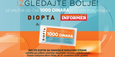 Kompanija "Diopta", vodeći lanac optičarskih radnji u regionu, sa mrežom od 30 objekata samo u Srbiji, u saradnji sa dnevnim listom Informer svim čtaocima danas poklanja vaučer u vrednosti od čak 1.000 dinara!