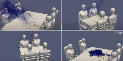 Simulacija pokazuje emisiju i tok aerosoli kada četvoro ljudi sede za stolom i razgovaraju bez zaštitnih maski, a pretpostavlja da mesto gde neko sedi u velikoj meri utiče na širenje koronavirusa.