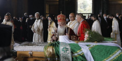 Preko njegovog kovčega prebačen je zeleni plašt, a na njemu stoje predmeti koji se vezuju za život patrijarha - jevanđelje, panakamilavka, žezal, krst.
