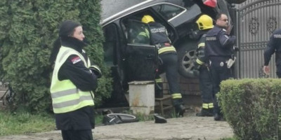Vozač "audija" izgubio je kontolu nad vozilom, izleteo sa puta, preleteo preko travnjaka, a potom udario u kuću i popeo se zadnjim delom vozila uz zid.