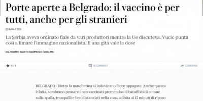 Italijanski mediji danima unazad bruje o uspešnosti procesa imunizacije u našoj zemlji. Pre nekoliko dana je dnevni list "Korijere dela Sera" objavio vest sa naslovom "Imunizacija od Beograda do Srbije i nazad, Beograd dozvoljava svima da se vakcinišu" u kojoj je izneo iskustvo menadžera Simonea Avogardija koji je u martu bio u Srbiji, vakcinisao se i vratio u Italiju. Danas je prestižni list "La Repubblica" na čitavoj stranici nahvalio proces vakcinisanja u Srbiji