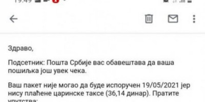 - Podsetnik: Pošta Srbije vas obaveštava da vaša pošiljka još čeka. Vaš paket nije mogao da bude isporučen 19/05/2021 jer nisu plaćene carinske takse (36,14 dinara). Pratite uputstva - glasi propratni tekst u mejlu.