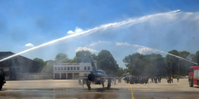 Legendarni avion MiG-21 sibolično je pozdravljen tradicionalnim vodenim slavolukom u čast dugogodišnje službe u našoj vojnoj avijaciji.
