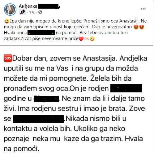 - Dobar dan, zovem se Anastasija. Anđelka uputili su me na Vas i na grupu da možda možete da mi pomognete. Želelea bih da pronađem svog oca - stajalo je u poruci upućenoj Anđelki.