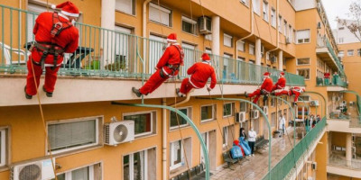 Deda Mraz se konopcima spustio sa krova dečje bolnice u Tiršovoj i ubacio poklone kroz prozor. Međutim, nije bio sam! Još petorica njegovih kolega su na isti način donela paketiće za mališane.