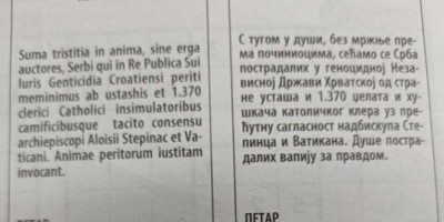 - S tugom u duši, bez mržnje prema počiniocima, sećamo se Srba postradalih u genocidnoj Nezavisnoj Državi Hrvatskoj od strane ustaša i 1.370 dželata i huškača katoličkog klera uz prećutnu saglasnost nadbiskupa Stepinca i Vatikana. Duše postradalih vapiju za pravdom. Petar - piše u čitulji objavljenoj na srpskom i latinskom jeziku.