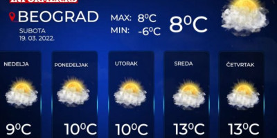 Vetar slab i umeren, istočni i jugoistočni. Najniža temperatura od -8 do -1, najviša dnevna od 8 do 11 stepeni, saopštio je Republički hidrometeorološki zavod.