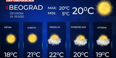 Vetar slab i umeren, na istoku Srbije povremeno jak, zapadni i severozapadni. Najniža temperatura od -4 do 5, a najviša od 18 do 22 stepena, saopštio je Republički hidrometerološki zavod.