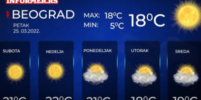 Posle hladnog jutra, tokom dana će u Beogradu sutra biti sunčano i toplo. Vetar slab i umeren, severni i severozapadni. Najniža temperatura od 0 do 5 °C, najviša dnevna oko 18°C.