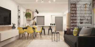 - Izdaje se stan u Radničkoj ulici od 35 kvadratnih metara. Stan je u fulu, cena je 370 evra. Stan nije za prosečne ljude koji rade za 50000 dinara. Stan je namenjen bogatijim studentima sa juga Srbije ili iz Bosne – doslovce piše u oglasu, uz fotografije stana koji je ponuđen za iznajmljivanje.