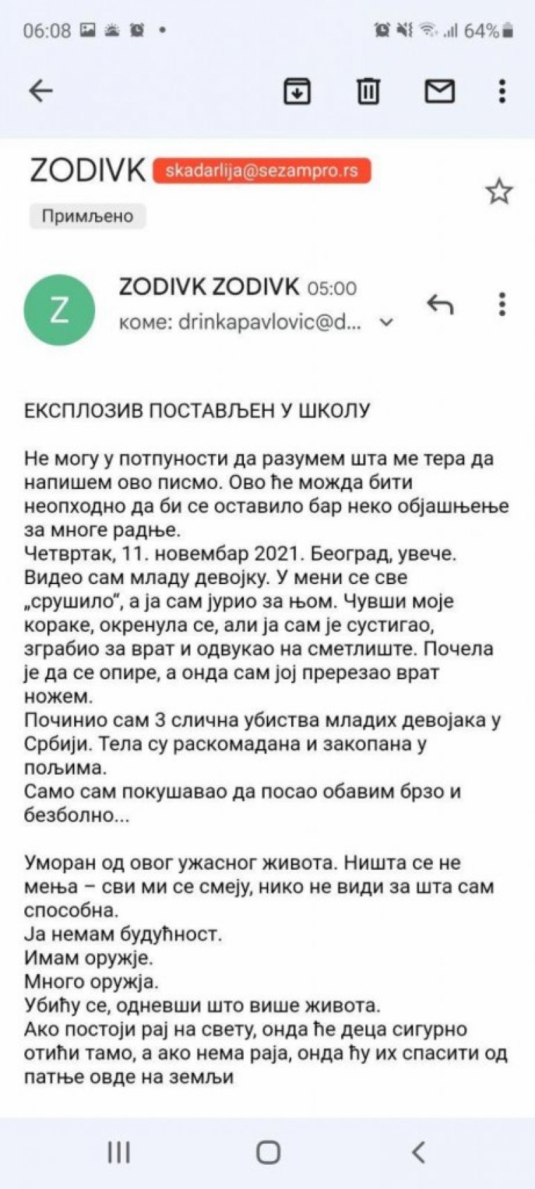 Izuzetno uznemirujuća je dojava koja je stigla na adresu O.Š. Drinka Pavlović u Beogradu.