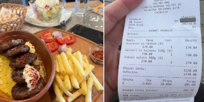 Kako se vidi na računu, na njemu se nalaze uštipci od mesa sa kajmakom, šopska salata kao i espreso sa mlekom. Cena kafe iznosi neverovatnih 170 dinara, 300 grama šopske salate je 270 dinara, a uštipci na kajmaku su 790 dinara. Ceo račun iznosi 1.230 dinara.