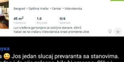 - Još jedan slučaj prevaranta sa stanovima. Toliko je očigledno i da nije žalosno, bilo bi smešno. Slike i pojedini delovi teksta preuzeti sa rumunskog sajta za izdavanje garsonjera - upozorila je jedna devojka na društvenim mrežama.