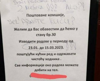 - Poštovane komšije, želim da vas obavestim da ćemo u stanu broj 30 izvoditi radove u perodu od 23. januara do 15. marta 2023. godine, poštujući kućni red i održavajući čistoću hodnika. Za sve informacije pozovite broj... Srdačan pozdrav i hvala na razumevanju - napisao je.