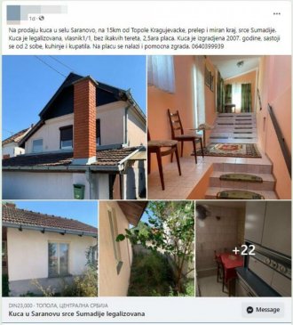 Kako je napisao prodavac u jednoj grupi za prodaju nekretnina, kuća je legalizovana, bez ikakvih tereta i postire se na 2,5 ari placa. Relativno je "mlada", izgrađena 2007. godine, a sastoji se od dve sobe, kuhinje i kupatila.