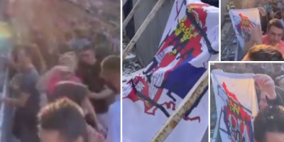Atmosfera je ponela mladića, pa je krenuo da igra sa zastavom i da je ističe, što nikome nije smetalo, do ovog trenutka koji možete pogledati na snimku ako premotate na 0:35 sekundi.