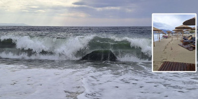 Snažan vetar obarao je suncobrane, a letele su i ležaljke po nekoliko metara po plaži. Visina talasa koja zapljuskuje plažu zabrinjavajuće je velika.