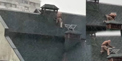 Naime, čovek je po pljusku šetao po mokrom i klizavom krovu, po svoj prilici pokušavajući da zatvori krovni prozor. Međutim, vetar mu je zadavao ozbiljne muke, ali on nije odustajao.