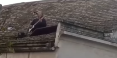 Naime, čovek je pomerio nekoliko crepova sa krova i izašao do pola, sa sve gitarom u rukama, ali je ovo verovatno bio planiran nastup, budući da je imao i mikrofon.