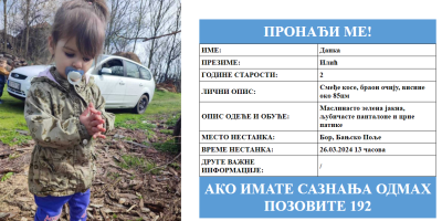 Nestala devojčica Danka Ilić (2), kojoj se svaki trag gubi od utorka oko 13 časova u prigradskom naselju Banjsko polje kod Bora, dok se igrala sa majkom i bratom, nije nađena ni posle celonoćne potrage.