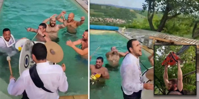 Međutim, i to je bilo tek početak neobičnih događaja. U jednom trenutku, na snimku se pojavljuje mladić koji vitla motornom testerom, dodatno podižući nivo neobičnosti ove proslave.