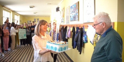 Učenici i nastavnici OŠ "Dr Đorđe Natošević" iz Novog Slankamena su, na najlepši mogući način - uz tortu, muziku, suze i smeh, ispratili omiljenog nastavnika Kostu i poželeli mu srećan odlazak u penziju.