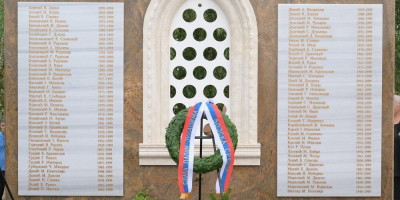 Po blagoslovu patrijarha srpskog Porfirija, spomenik je u porti crkve prošle godine podiglo udruženje "Pećanci za večnost". Danas su vence položili i odali poštu i predstavnici brojnih udruženja koji neguju tradicije sa Kosova i Metohije.